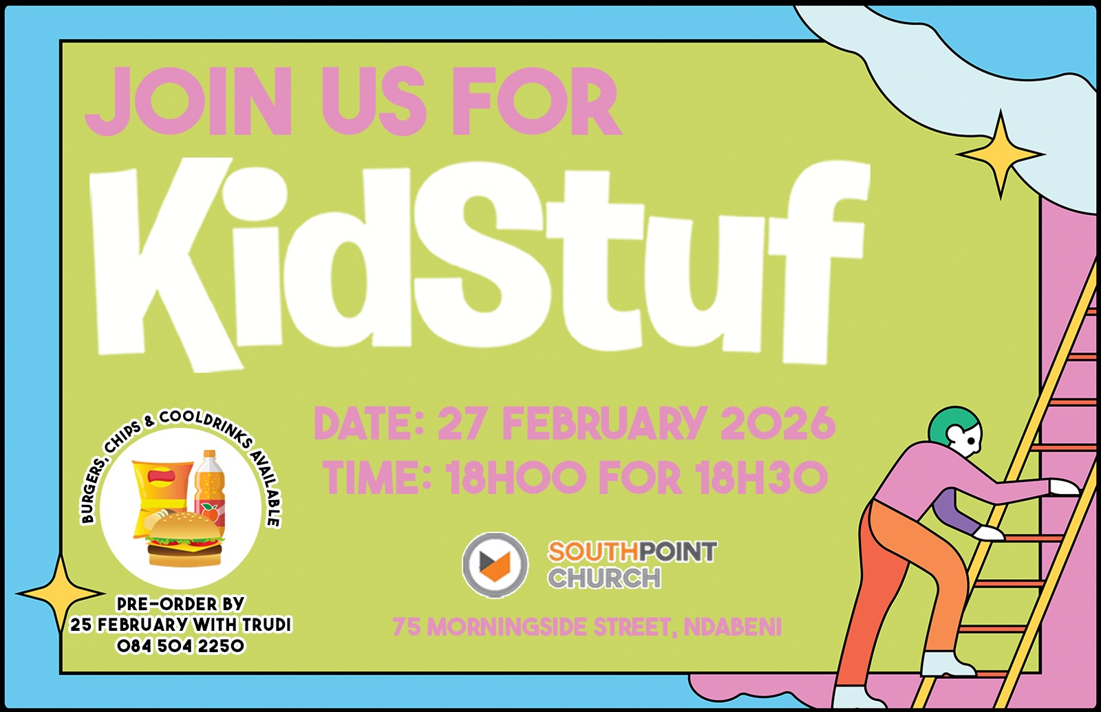 🍔 Pre-book your burger combos by 25 February with Trudi on 084 504 2250